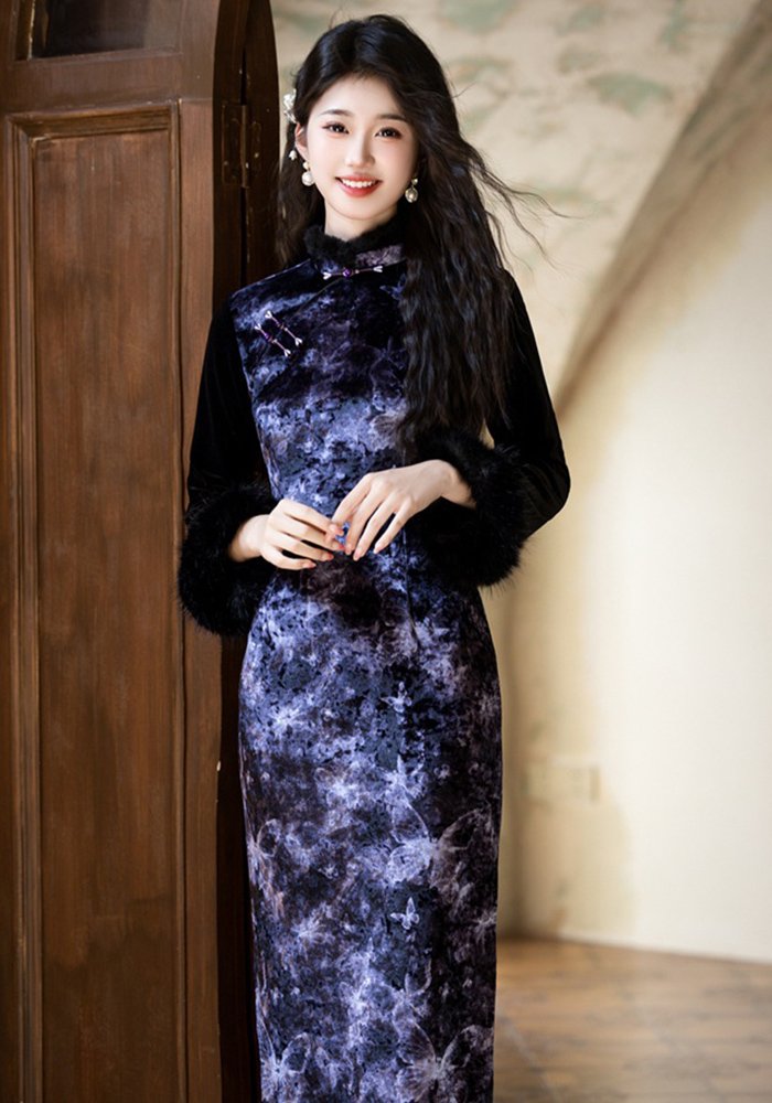 Autumn and Winter Elegant Velvet-Trimmed Qipao