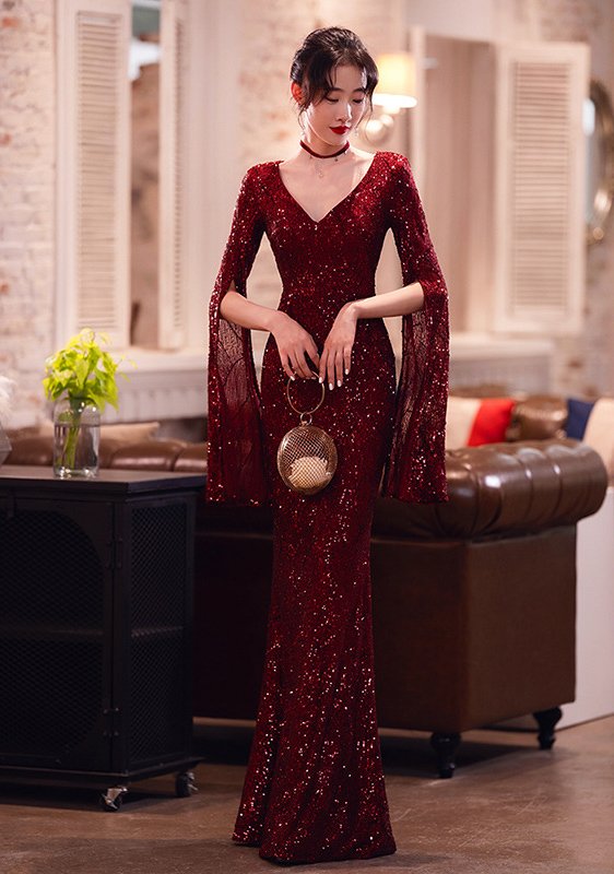 Elegant Red Sequined V-Neck Evening Gown