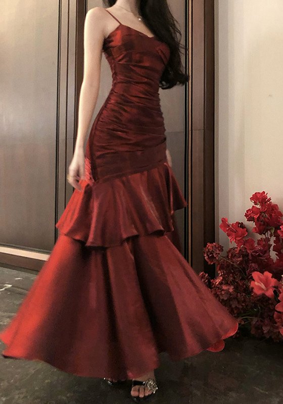 The skirt is designed with multi-layered tiered ruffles, creating a flowing, dynamic drape that moves beautifully with every step, infusing the look with an ethereal, atmospheric charm. The mermaid cut further accentuates a graceful, slender figure.