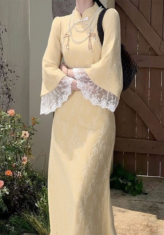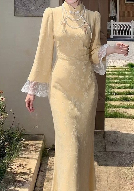 Elegant Yellow Cheongsam Delicate Lace-Trimmed Sleeves