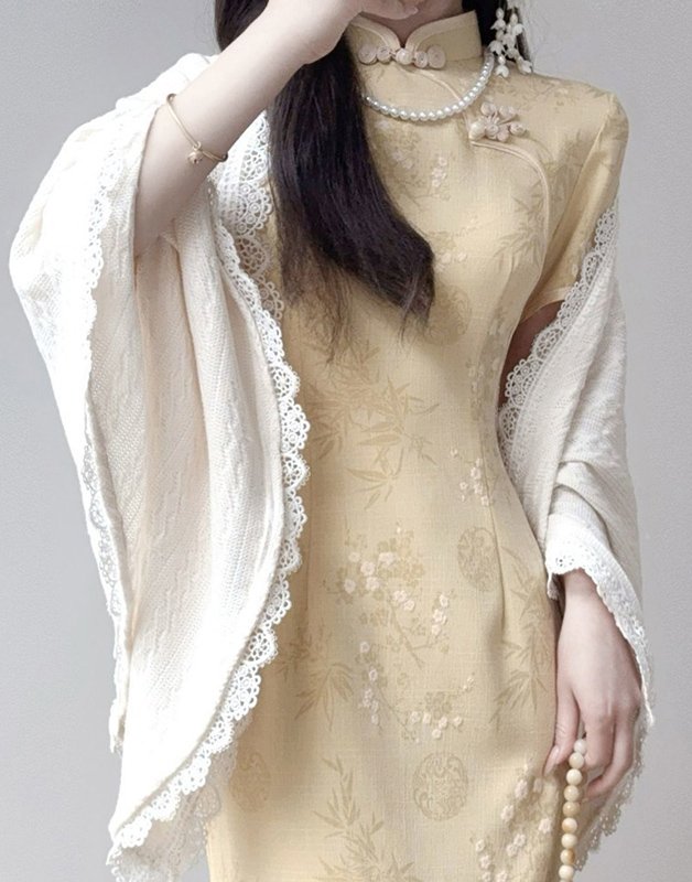Cheongsam With Delicate Lace-Trimmed Sleeves and Beige Shawl