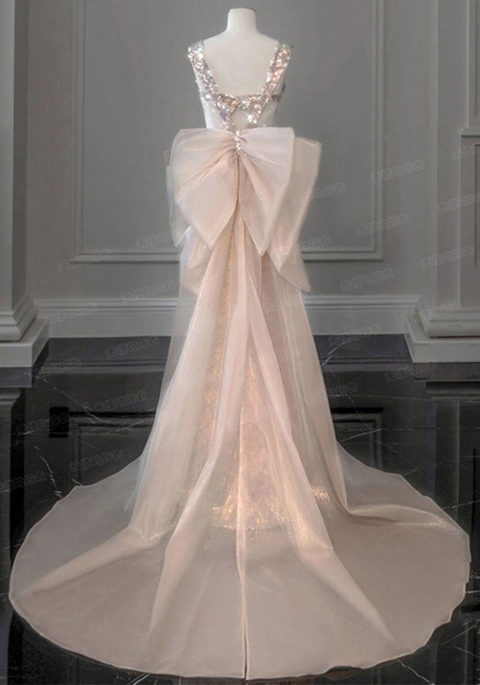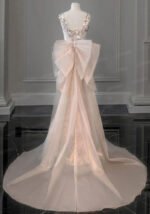 The open back features intricate beading, crowned by an oversized, ethereal organza bow that cascades into a soft, sweeping train—adding a fairy-tale, red-carpet worthy finish.