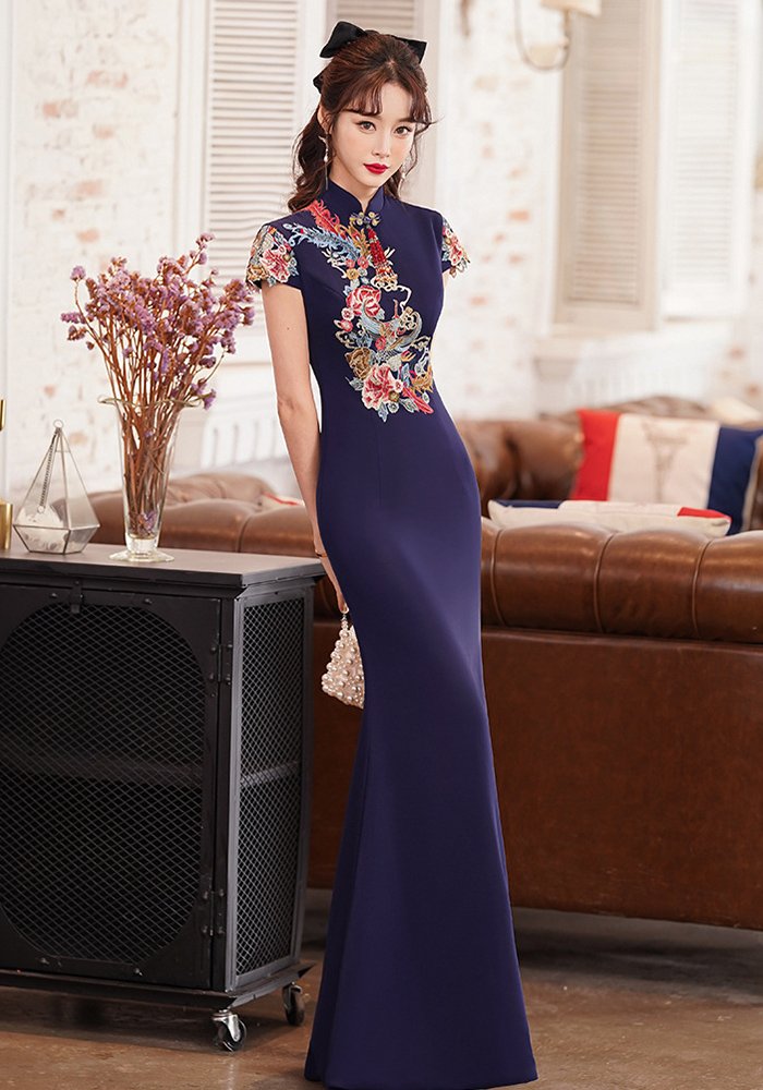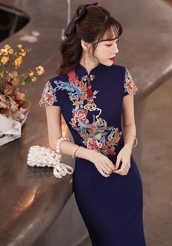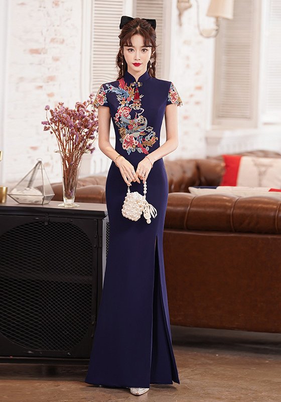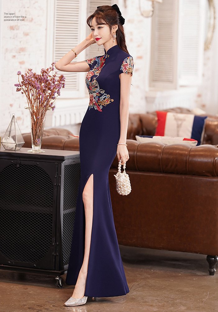 Elevate your formal wardrobe with this stunning navy blue cheongsam (qipao), a masterful fusion of traditional Chinese artistry and contemporary elegance. Designed to make a statement at banquets, galas, weddings, or cultural celebrations, this dress embodies grace, sophistication, and timeless charm.