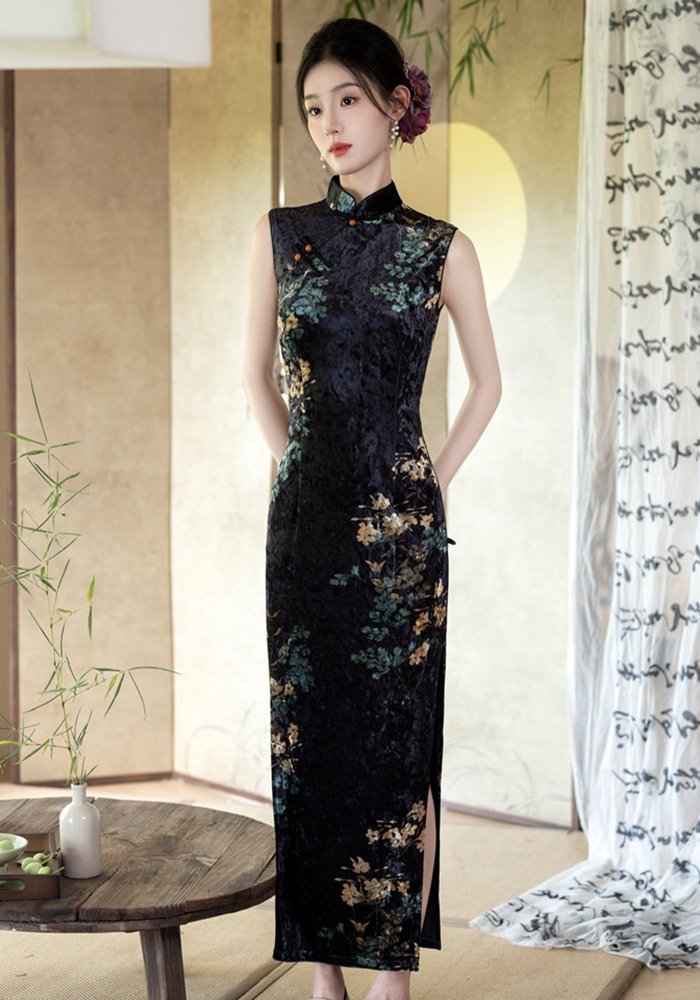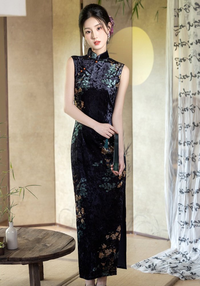 Retro Velvet Autumn Sleeveless Cheongsam Dresses
